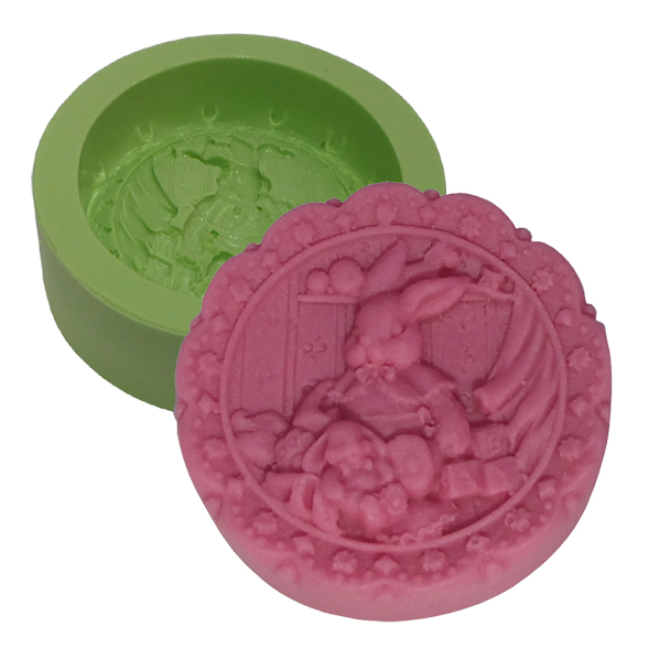 Molde de silicone Redondo Coelho Brincando (1 cav.), cód. 7350 para fins artesanais.